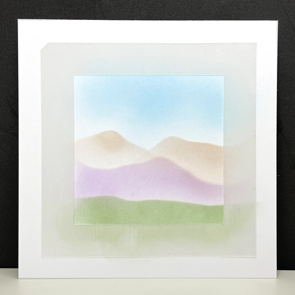 Next I turned the hill makes around so the shape was at a different angle, then using a large stencil brush and Elements Soft Cygnet, made the furthest hills and to give depth.