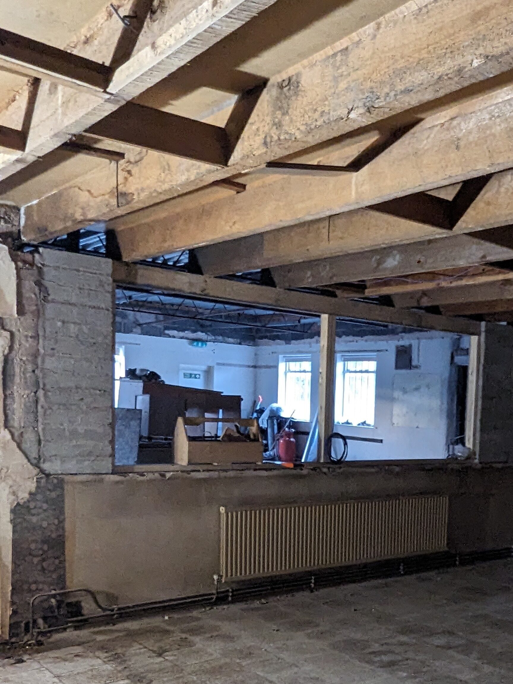 Even the back bar has lost its carpets and the ceiling too. At this point you would be forgiven for wondering- there are three floors to this property…what’s going on upstairs?
