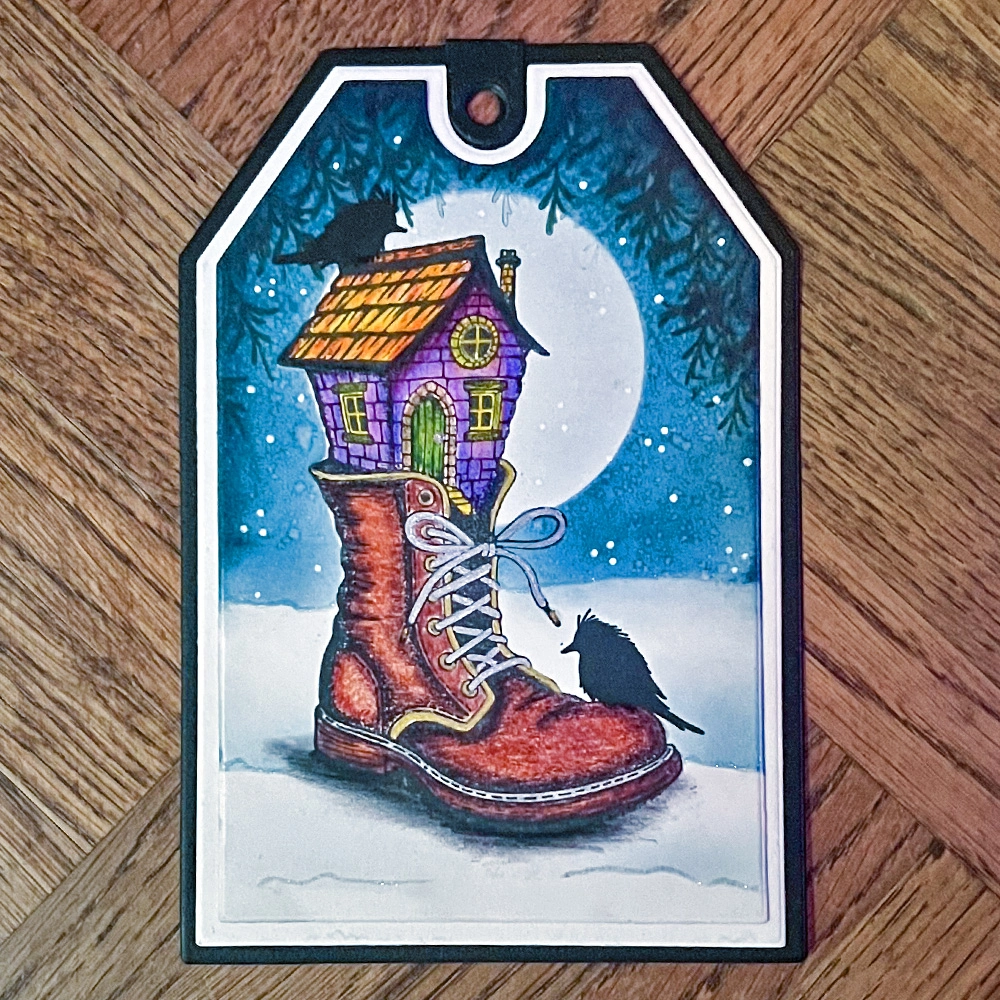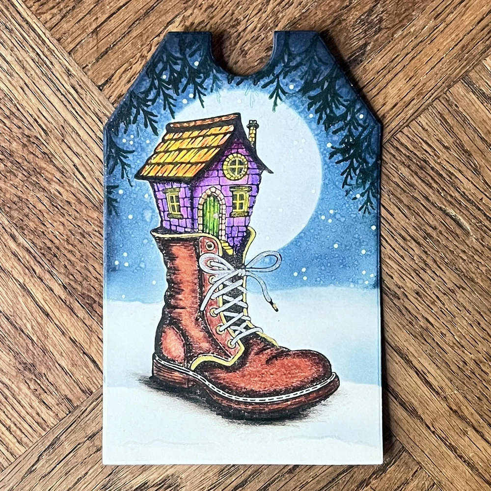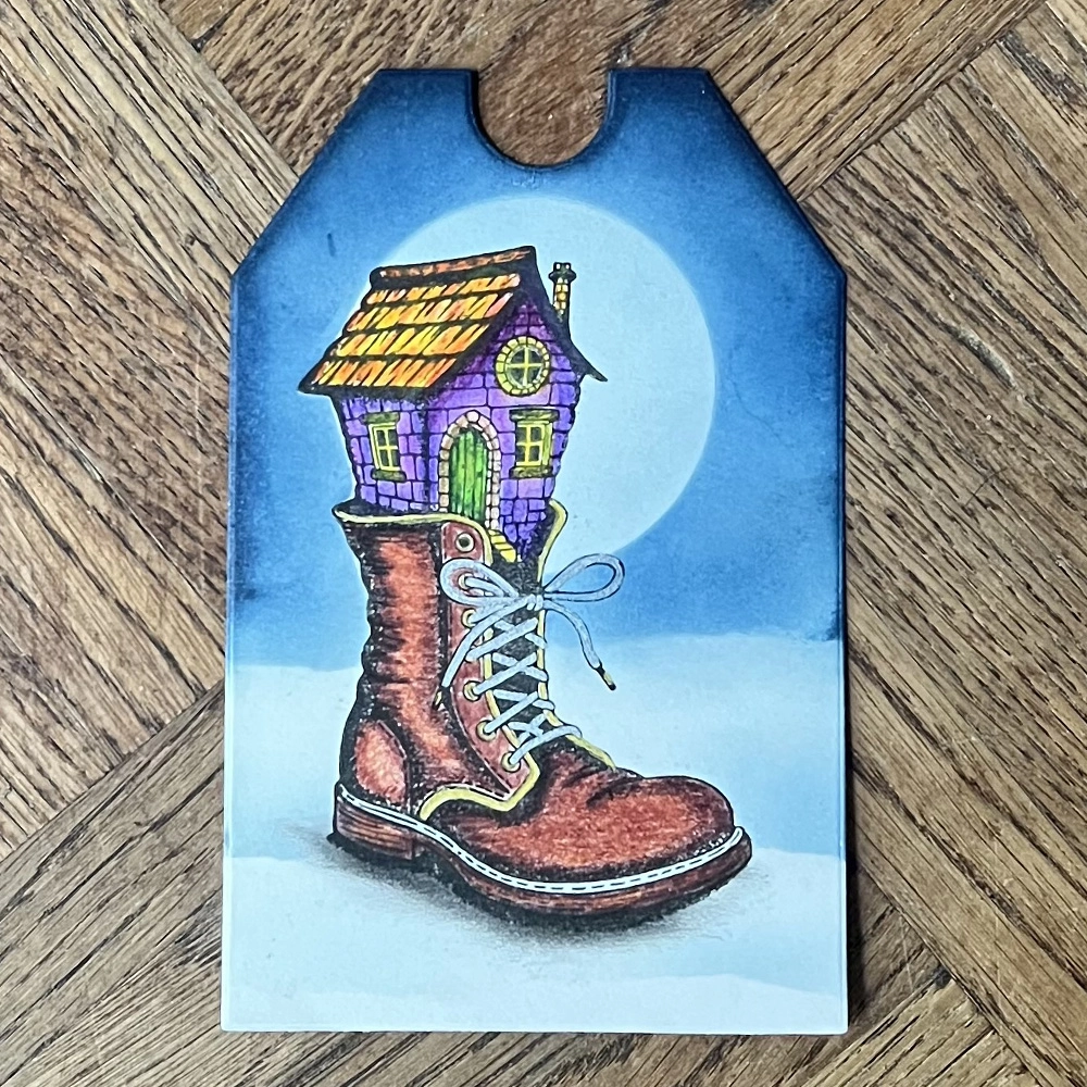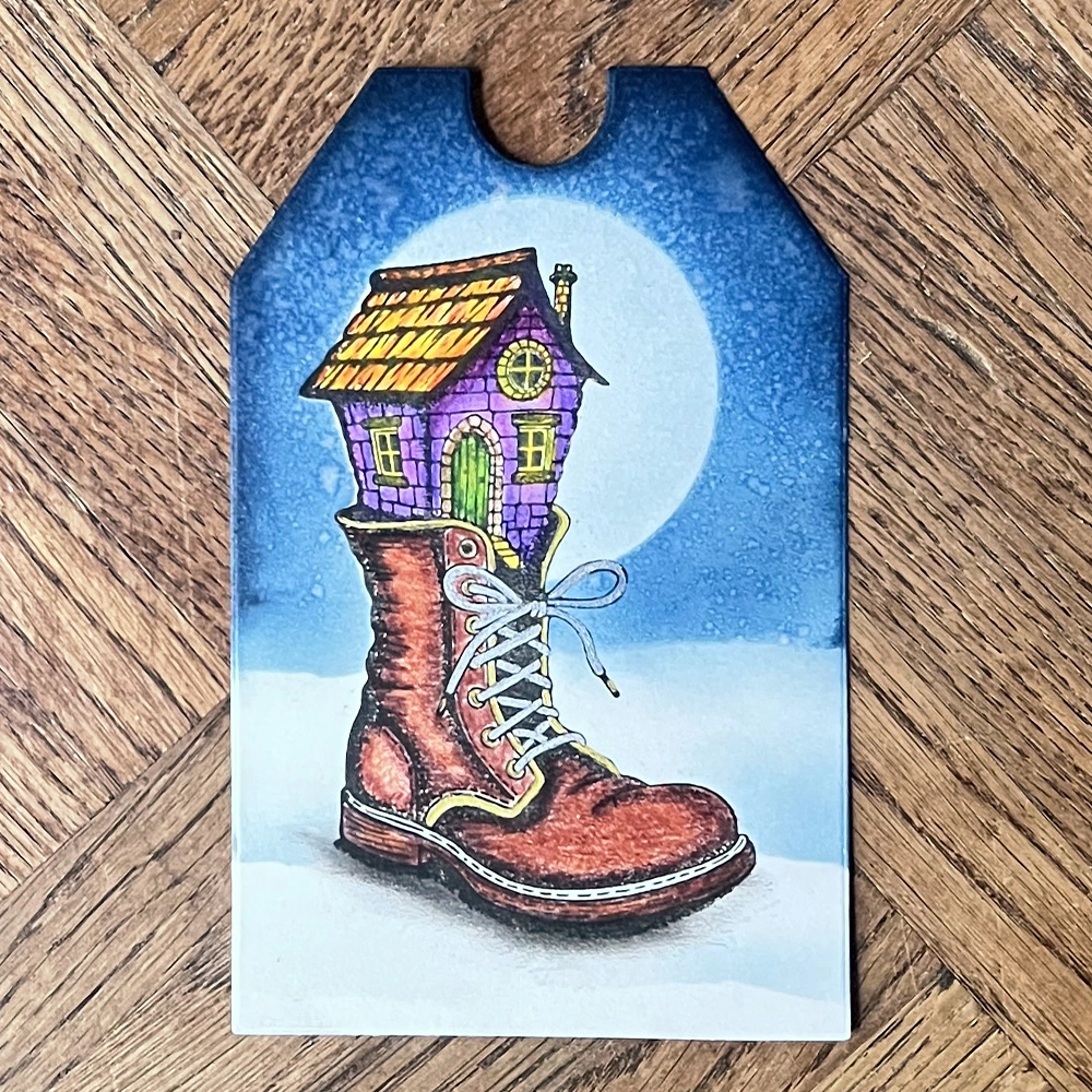 Colour the house at the top of the boot with the Mondeluz Watercolor Pencils, using a mix of yellows, purples, greens, and other shades. Add a touch of metallic shimmer to the ends of the shoelaces and the doorknob using Stickles Glitter Glue in Gold.