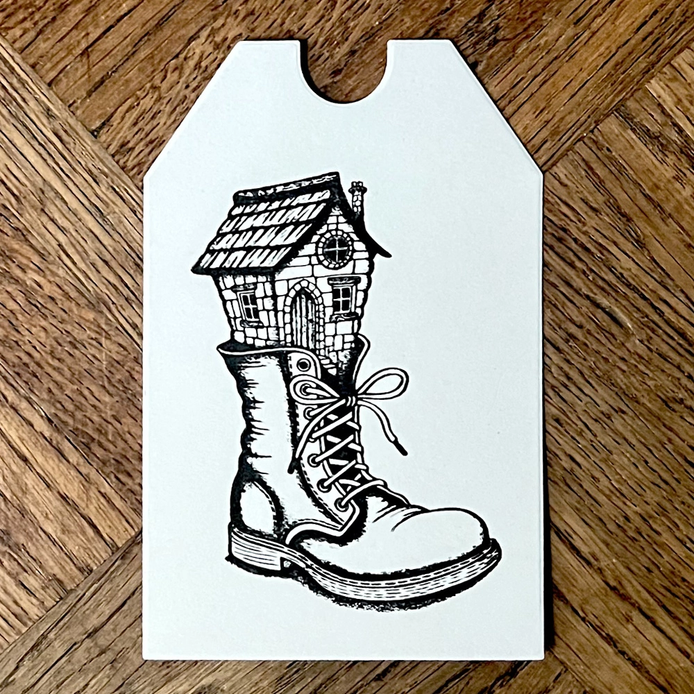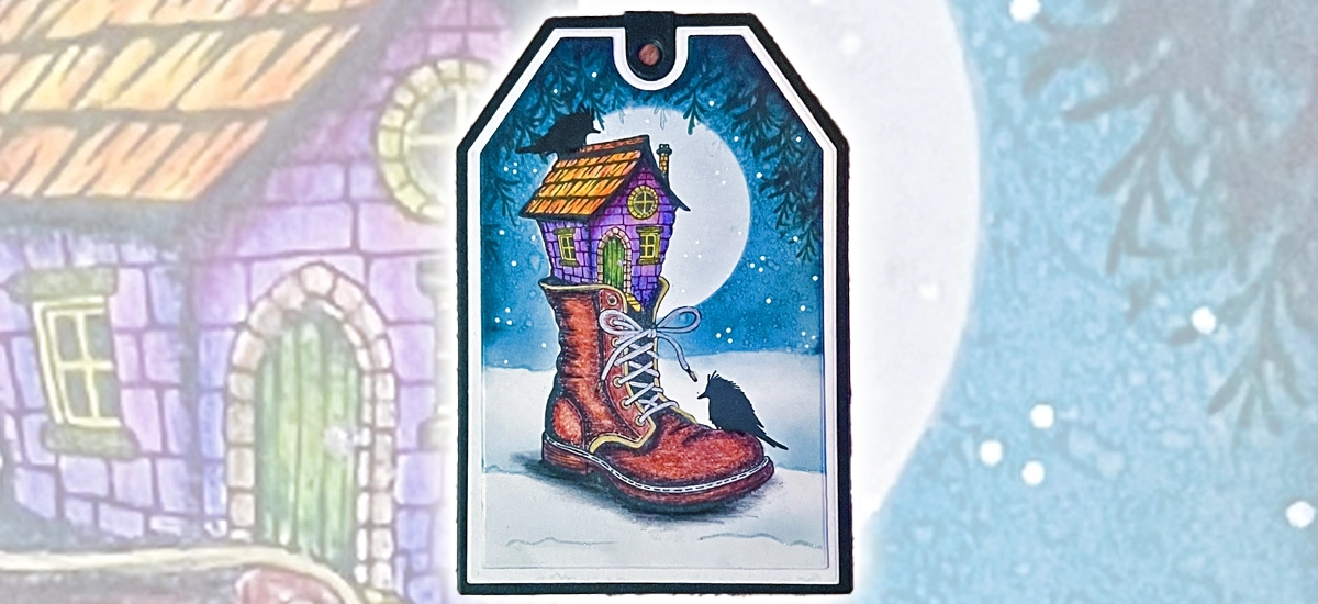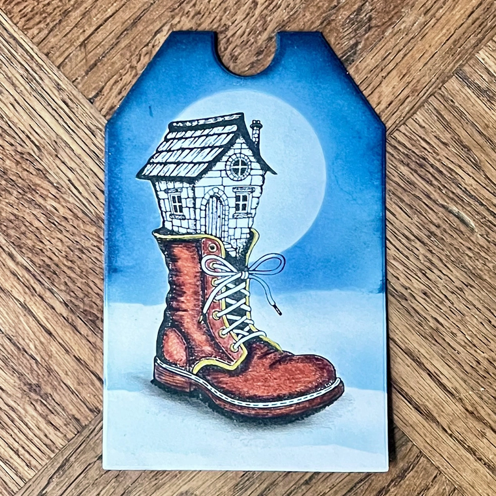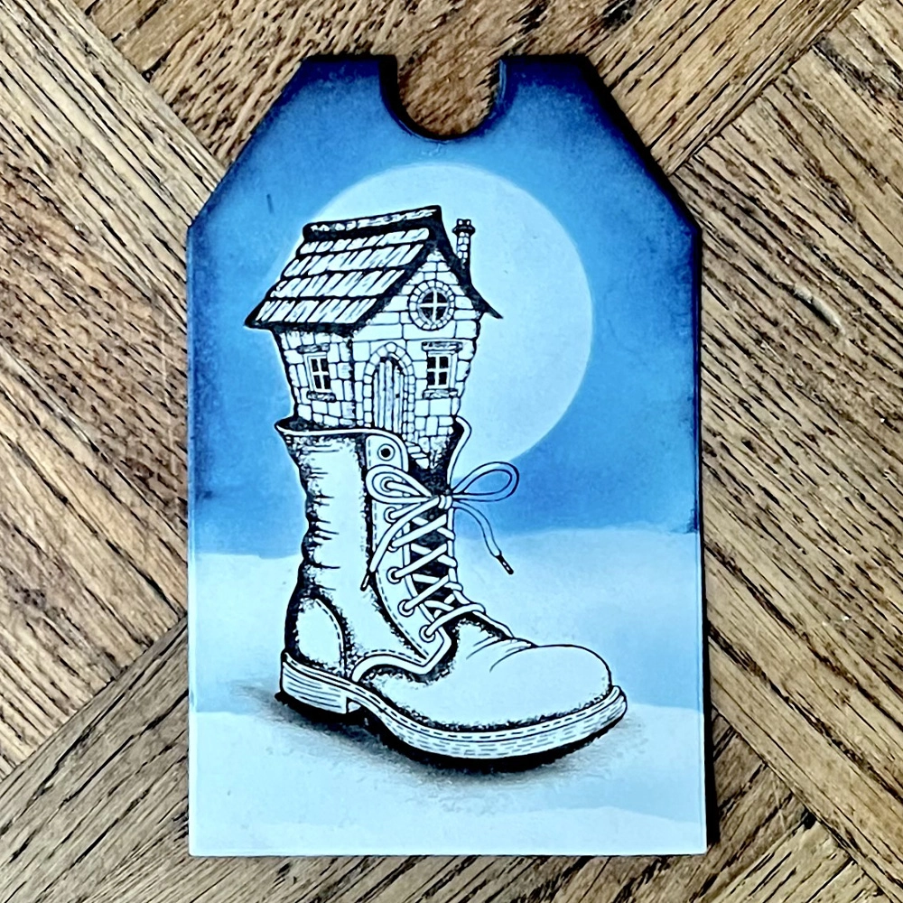 Colour the house at the top of the boot with the Mondeluz Watercolor Pencils, using a mix of yellows, purples, greens, and other shades. Add a touch of metallic shimmer to the ends of the shoelaces and the doorknob using Stickles Glitter Glue in Gold.