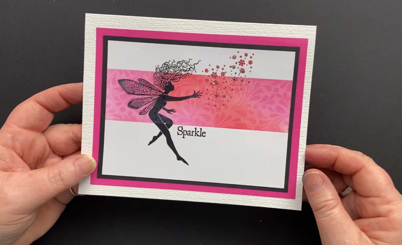 A background strip made using Distress Oxides and a Lavinia stencil, provides a simple, yet effective background for our lovely new fairy, Layla, on this neat little card from design team member, Karen Telfer.