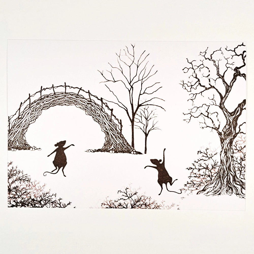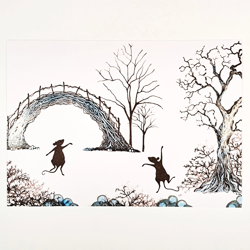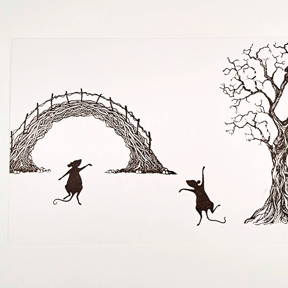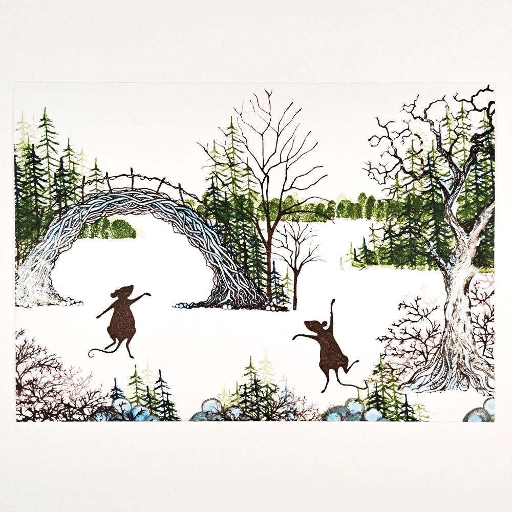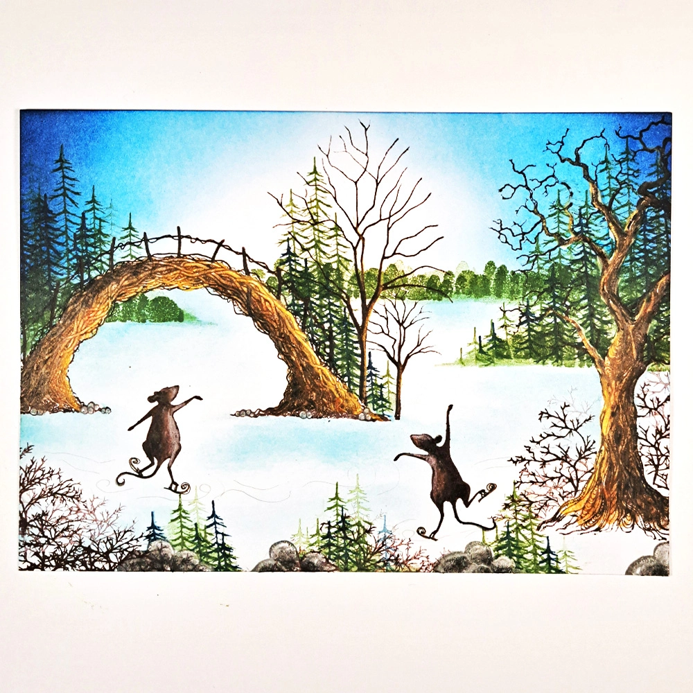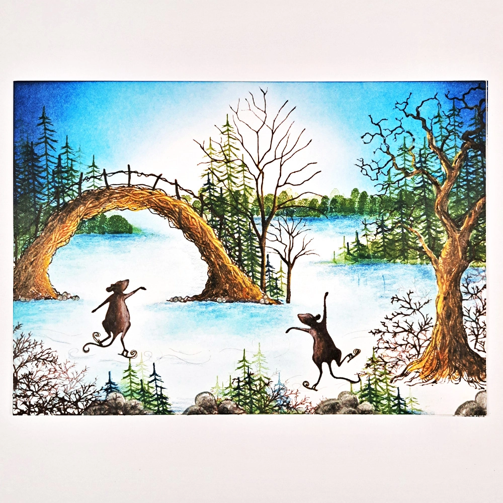 Now we can colour the bridge, trees, mice, and rocks. To give each element depth, use more than one colour. I love using the Mondeluz Watercolor Pencils because they are soft and blend beautifully. Even if the trees and mice are all brown, using different shades brings them to life. For the bridge and trees, use black, dark brown, light brown, reddish brown, and ochre. For the mice, use black, dark brown, medium brown, and white.