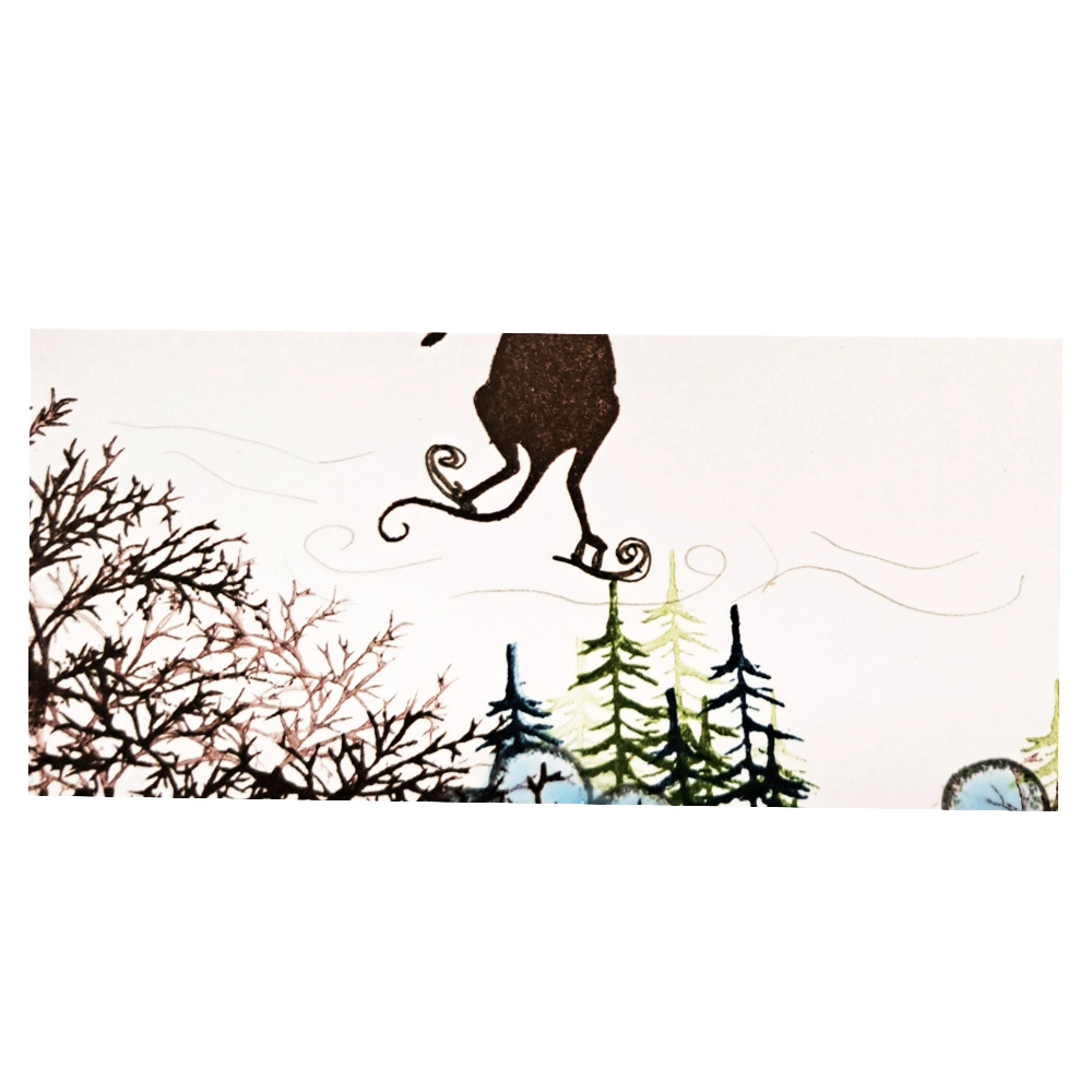 Add some more trees by stamping the Birch (LAV649), the Small Trees (LAV663), and the Fern Leaf (LAV124), all using Versafine Clair Ink in Fallen Leaves.