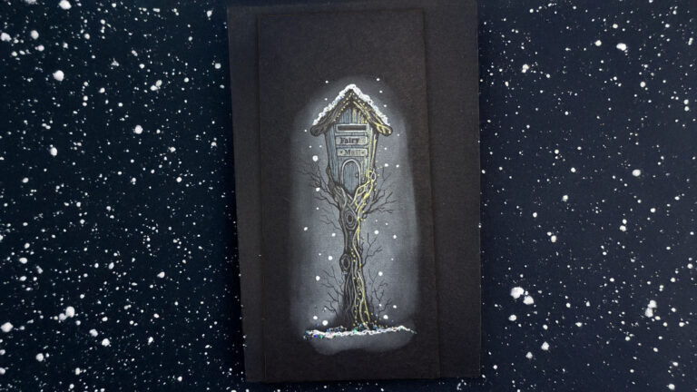 Join Sarah to craft a festive tag brimming with Christmas cheer. We’ll blend a rich background with Elements Inks — Bermuda and Flying Fig — then stamp the details in Versafine Clair. Decorations and snowflakes will dance around the scene while little Thistlewhisk keeps cosy beneath his toadstool brolly. We’ll bring everything to life with Mondeluz coloured pencils and a