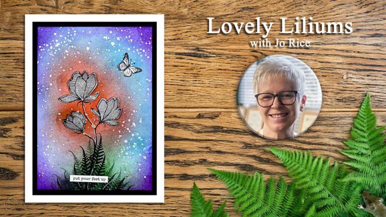 Hi everyone, Jo here again. Thanks so much for popping in. Today we’re going to create a fabulous, colourful background by blending some Elements inks. Next, we’ll stamp some Woodland Ferns and the lovely Lilium stamp. I’ll be decoupaging the petals to give a striking monochrome effect, which really pops against all that colour in the background. For the finishing