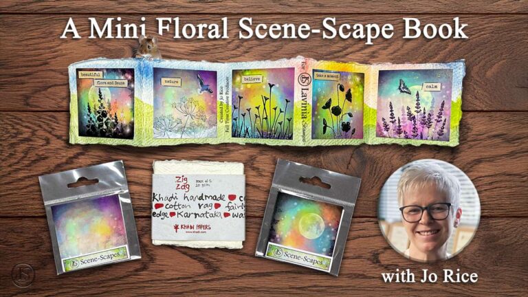 Hi everyone, Jo here again. I do hope today is treating you well, and that you’ll enjoy our crafty catch-up. Today we’re going to make a sweet little floral book using a mini cotton rag accordion book from the Khadi range. I’ll be stamping a selection of Lavinia’s beautiful floral stamps onto Mini Scenescapes. These gorgeous little ready-made backgrounds are