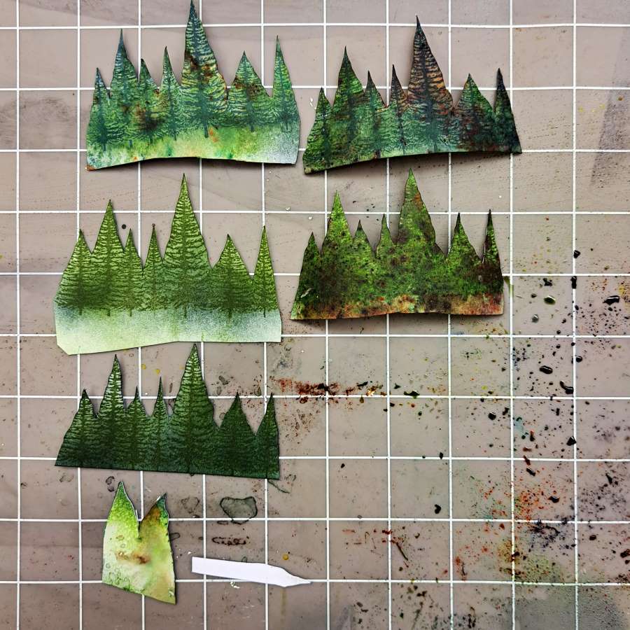 Cut out the trees and the moon. Put some left-over colour from your mat on the trees and the moon. This gives the colour some more depth.