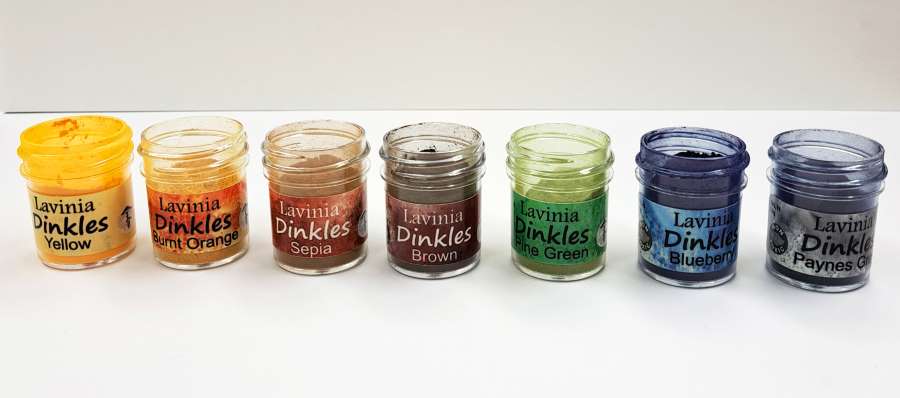 The colours of Dinkles I used. I line up the colours I want like in the picture and then I use paintbrushes to pick up some Dinkles powder. Then I sprinkle the Dinkles on my wet paper. You need very little product to create a lot of colour .