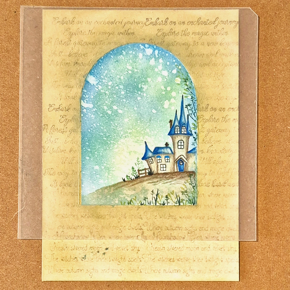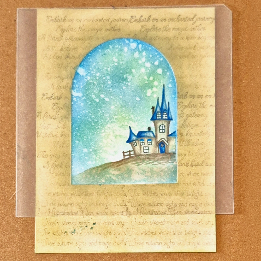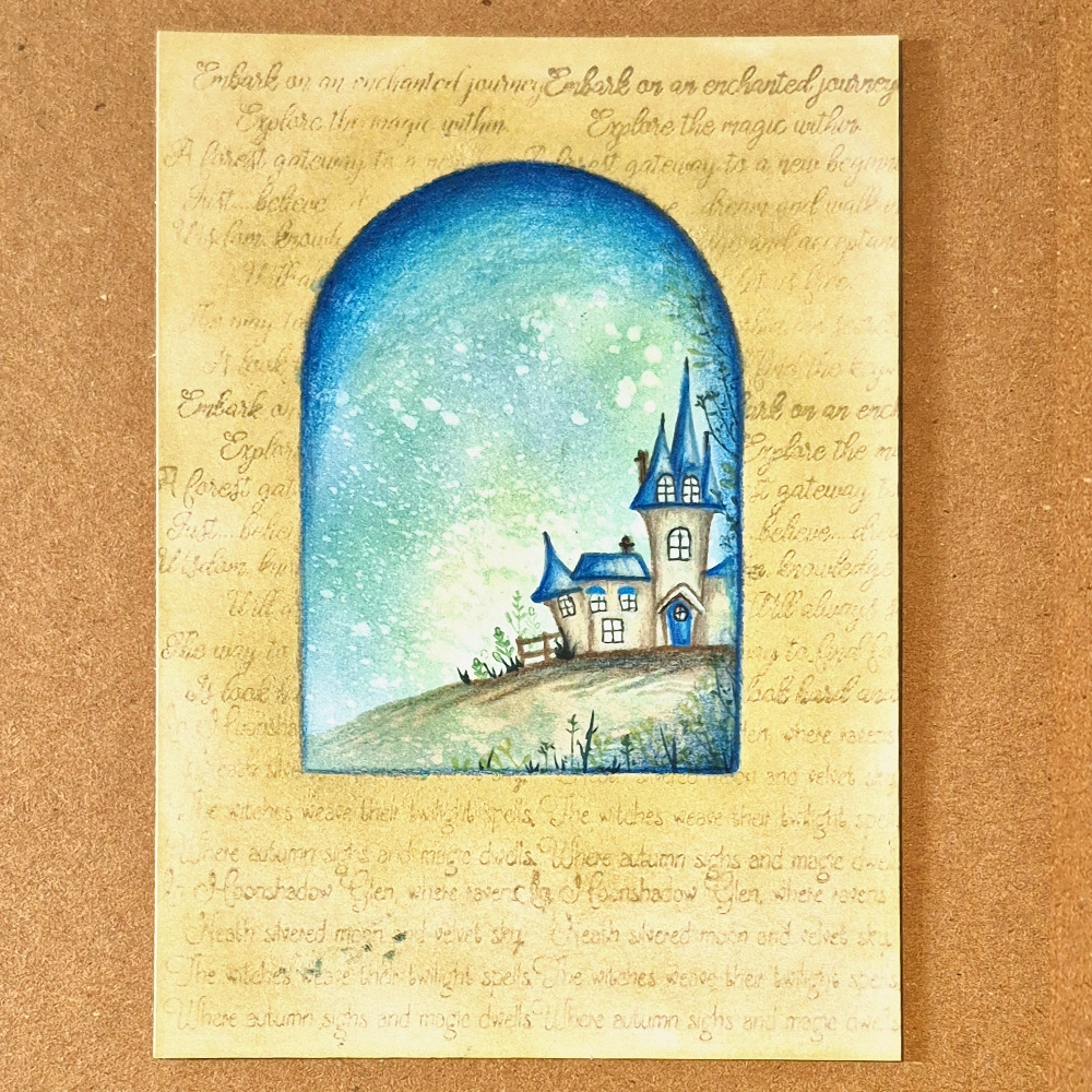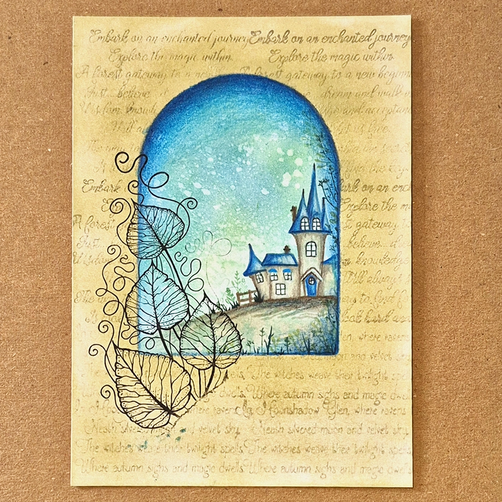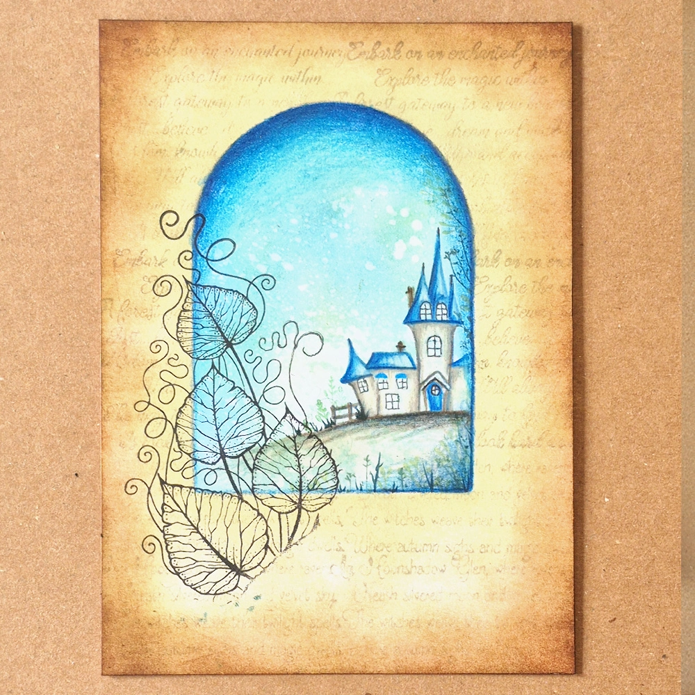 Finally, add in the sticker “Once upon a time….” From the Sentiment Stickers 6 Set (or a sentiment or sticker of your choice) on the top right of your arch. I then mounted my completed card onto a larger sheet of black card to give it a border/margin, and then lastly mounted that on to a buff coloured kraft card. It would look equally good on a white card I think.