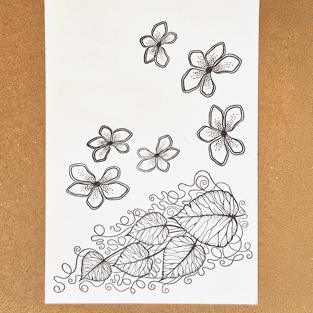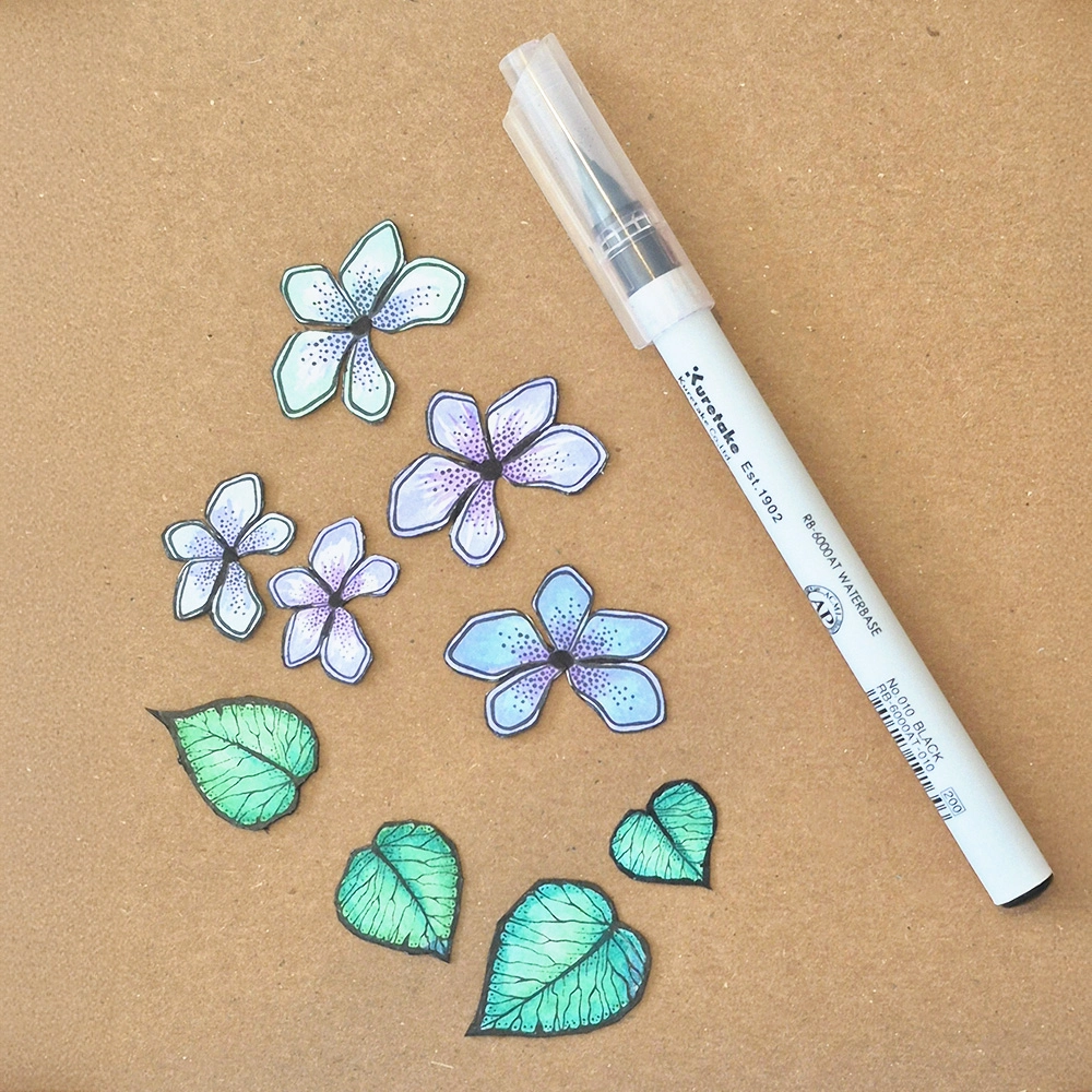 Add colour to the Forest Leaf Stamp on this separate card, and the Moss Flowers using shades of green for the leaves, and lilacs, blues and purples for the flowers with your Zig Clean Colour Pens or Coloured Pencils.