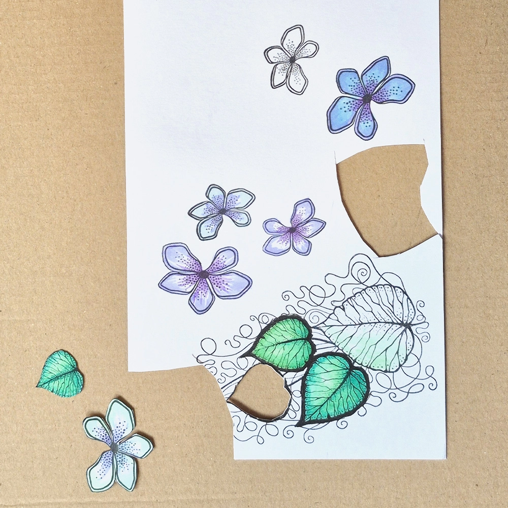 Fussy cut out all the coloured leaves, I used 4 for the left side, and an additional small leaf to add in at the right (see on final photo), so 5 leaves in total. Also fussy cut out at least 4 of the coloured Moss Flowers.