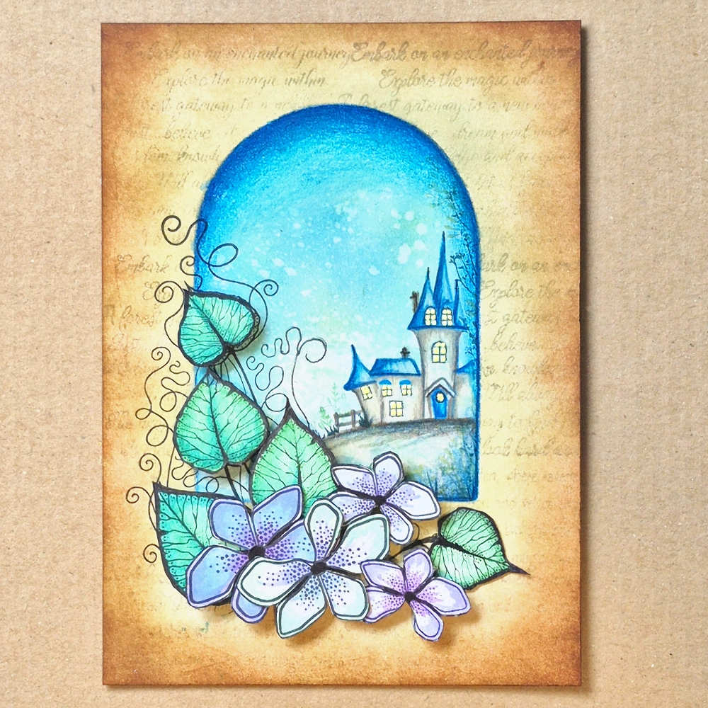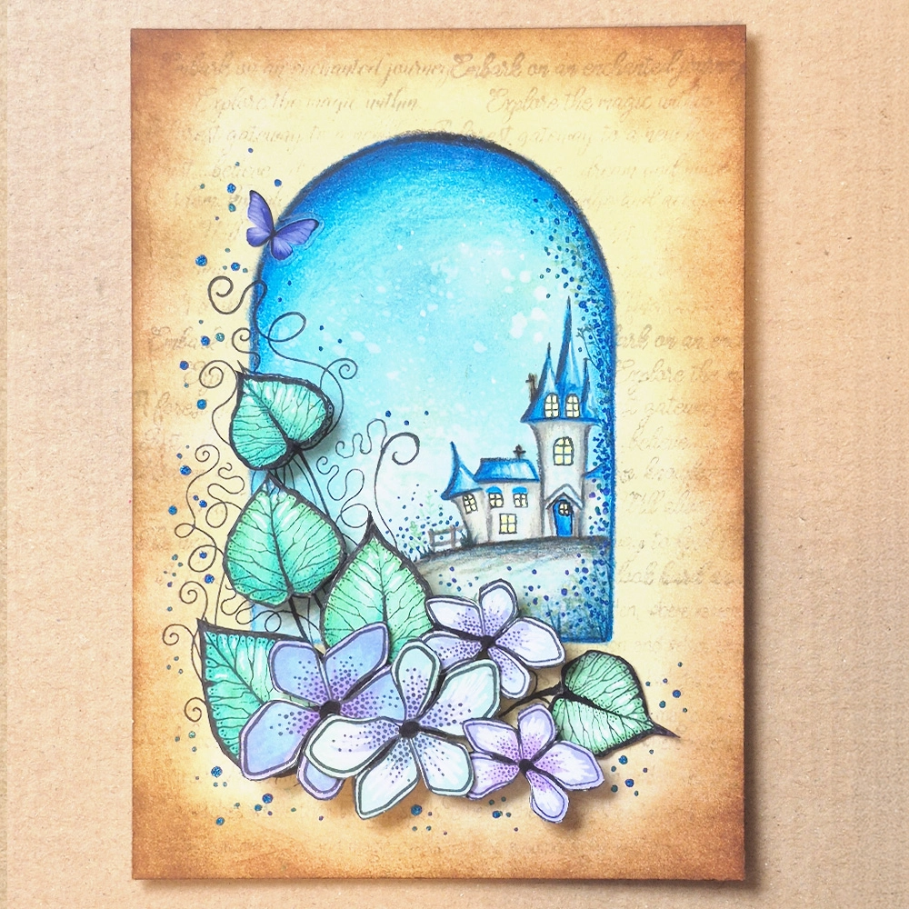 I used coloured pencils to add some depth to the top of my arch, and around the edges using shades of blue darker at the very top and blending lighter downwards. Ignore the bottom left corner of the arch as this will be covered.