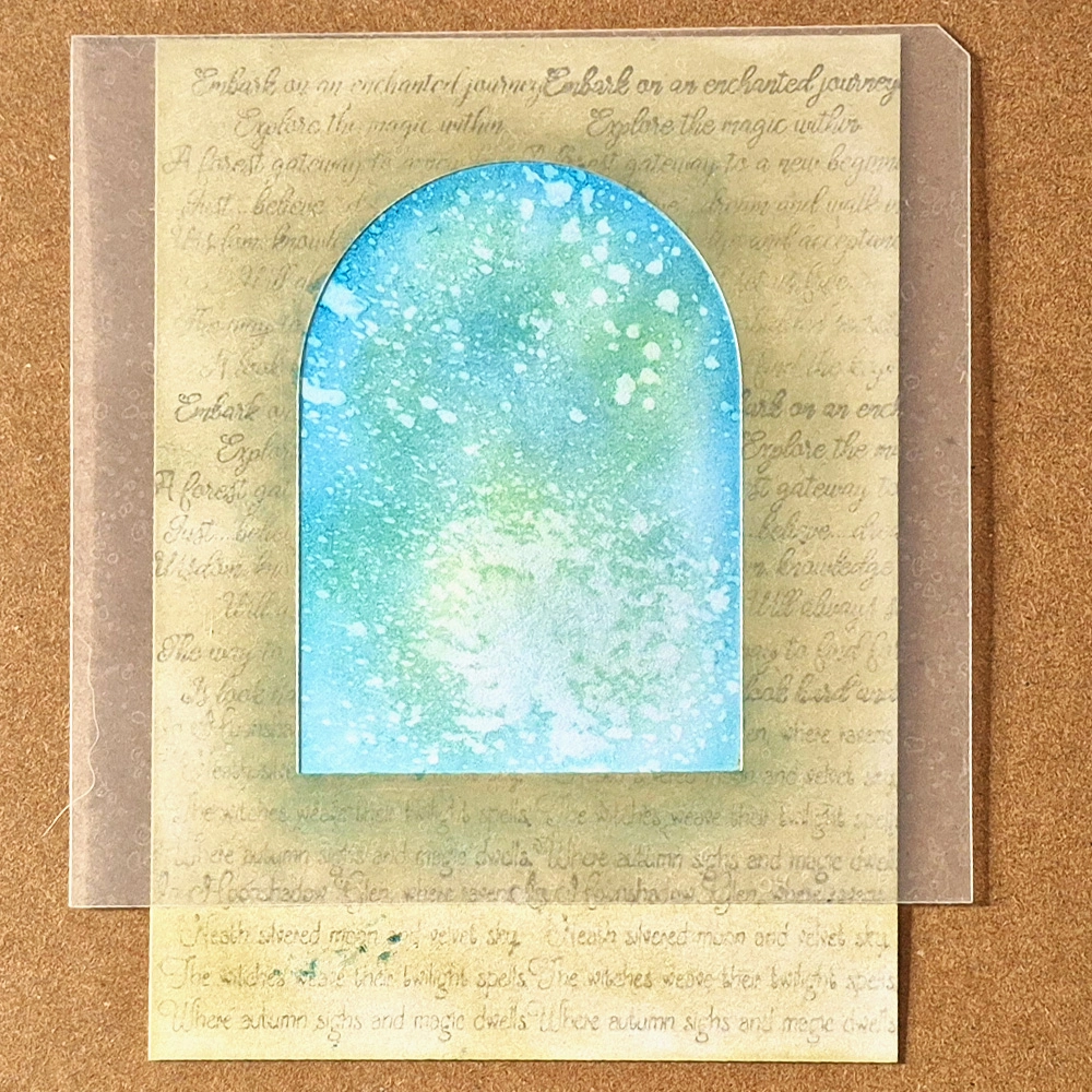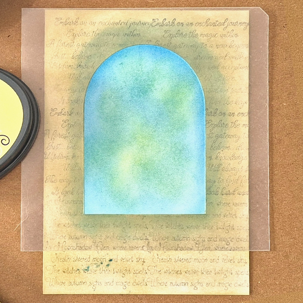 Remove the arch shaped sticker stencil and now place the outer part of the arch shaped stencil over your arch. Use Elements Ink and Lavinia Stencil brushes and add the following colours for an interesting background of sky, Blue Lagoon, Mermaid and Lemon Drop.