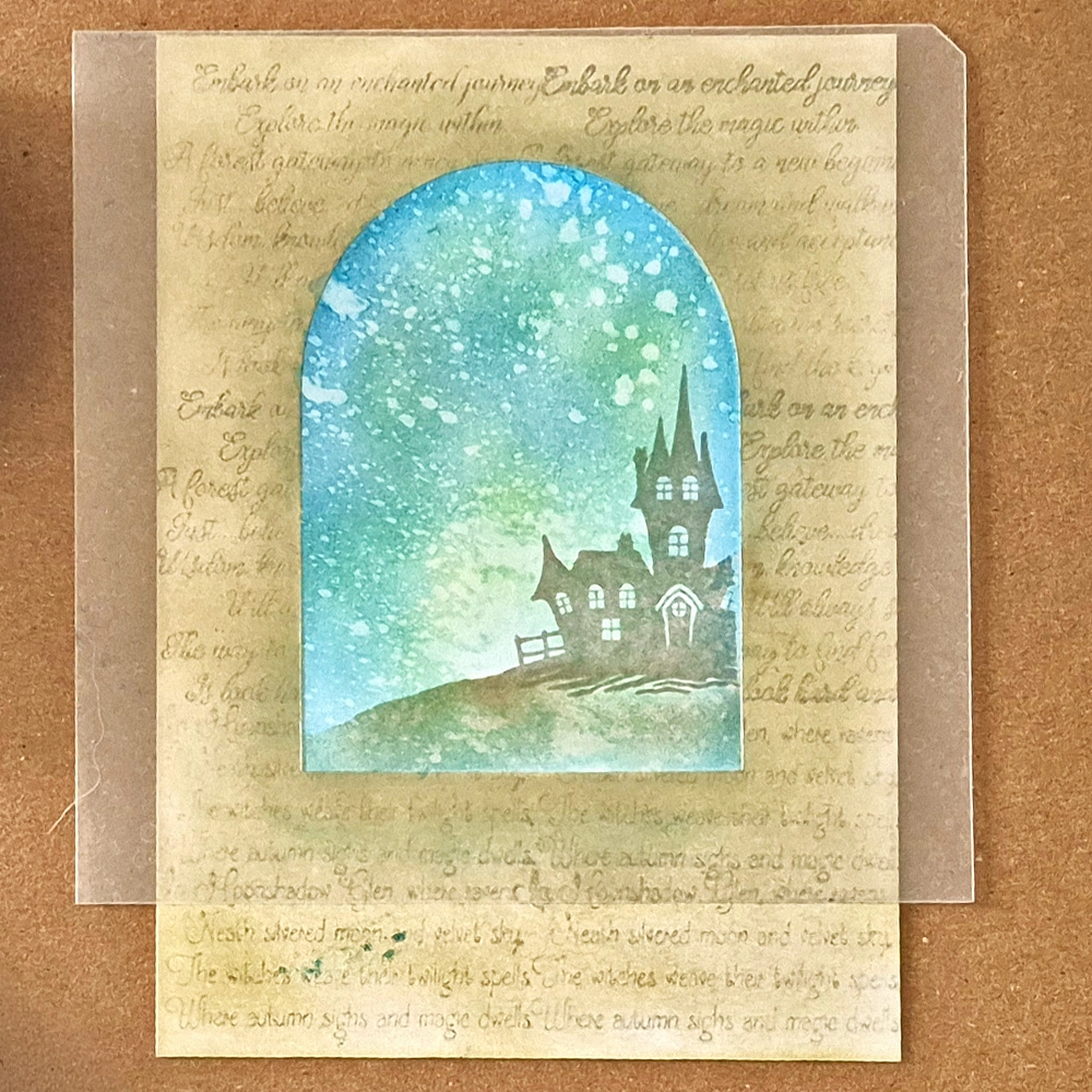 Stamp all over the inked background (with the arch sticker stencil still in place) using the Forbidden Secrets LAV878 and the Magic Dwells LAV1001 Stamps. I used the latter towards the bottom, but use them as you wish to cover the whole card. I used Versafine Clair Ink in Morning Mist, but I did use this in 2nd generation stamping so that it was more subtle.