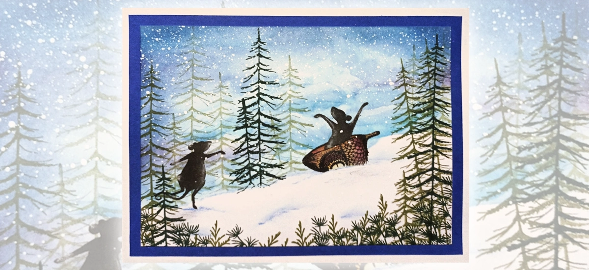 Use the Red Pine (Large) Stamp LAV591 to stamp some forest trees. I did this with Versafine Clair Shady Lane, using secondary stamping for the more distant trees. Stamp the acorn from Acorn Nest LAV982 in Versafine Clair Nocturne, masking half of it with spare paper to make it look like a sled buried in the snow. Then stamp the mice Tilly and Tango LAV726 as pictured, masking off the legs of Tango so he sits inside the acorn sled.