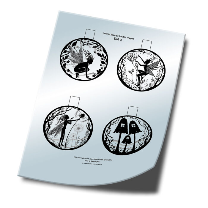 Four delightful images for you to print at home, onto our inkjet-printable acetate sheets. Specially produced to fit into our 10cm clear plastic baubles.