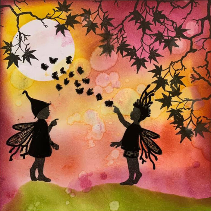 A set of two stamps featuring silhouettes of a pair of inquisitive fairy children.