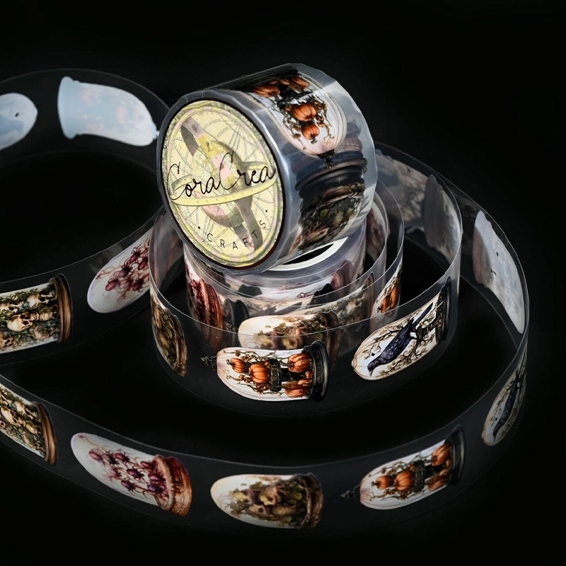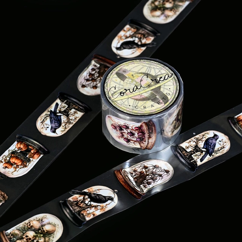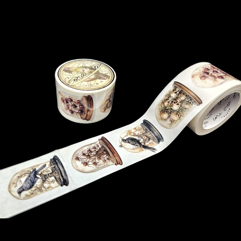Four washi tapes featuring specimin dome jars full of various organic items, birds and mysterious skulls, rendered in beautiful vintage-style illustrations.