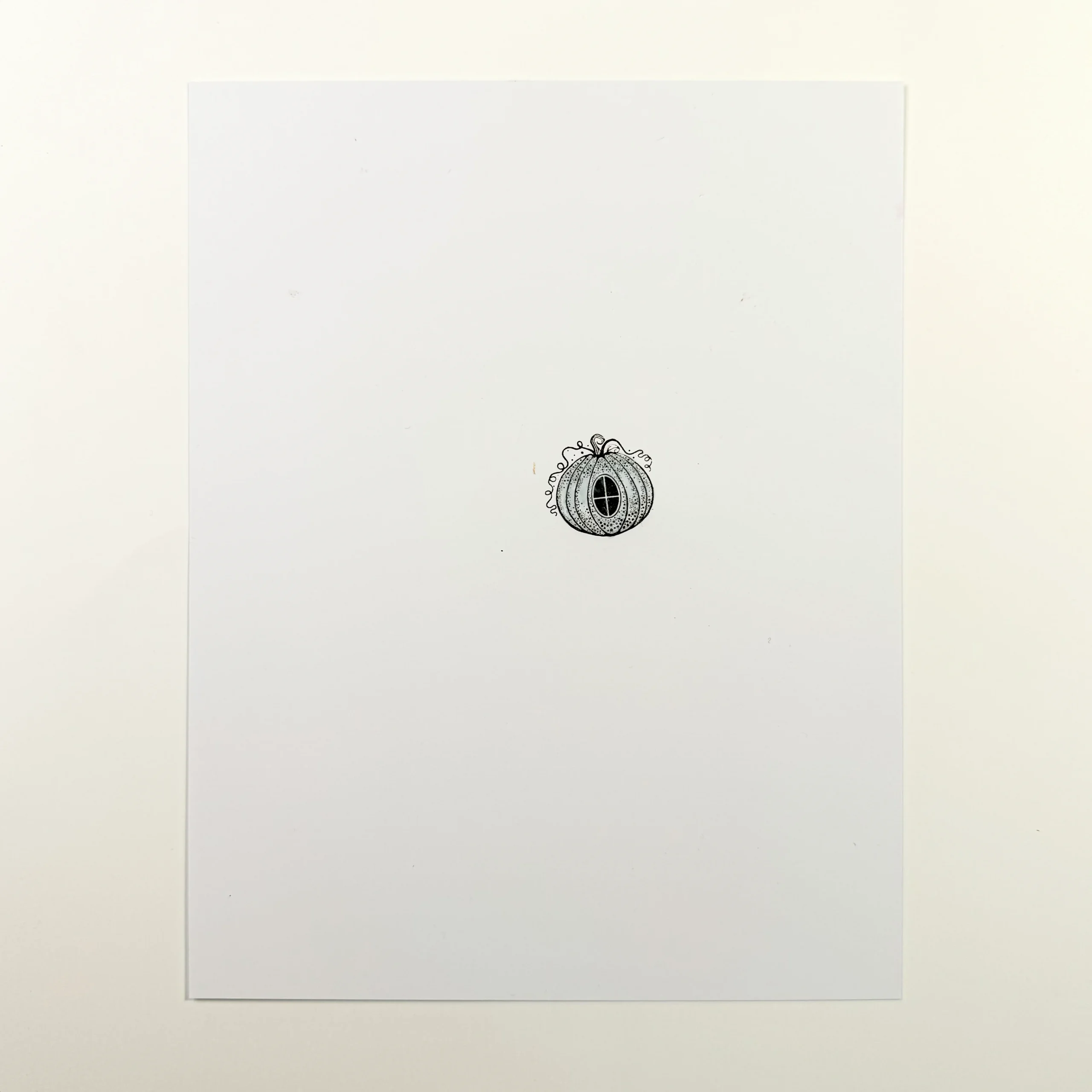 Stamp the Pumpkin Pad Stamp LAV824 as seen in the picture. Make sure there is no masking where you are going to stamp. Otherwise, rub off as needed. Use white Posca pen to paint over what is visible in the large pumpkin from those behind and cover with Masking Fluid. I found it difficult to calculate where to place the large pumpkin so I did this instead.