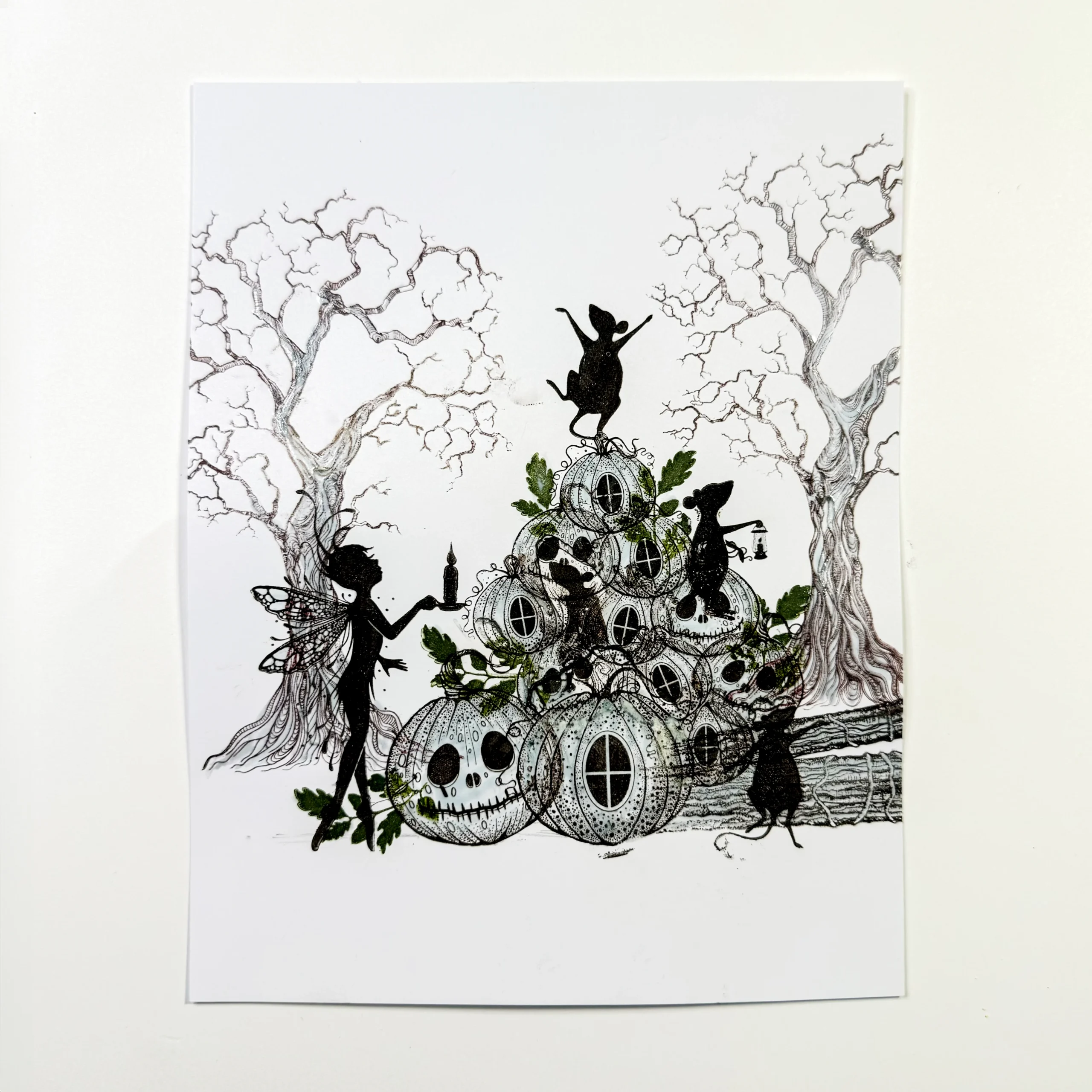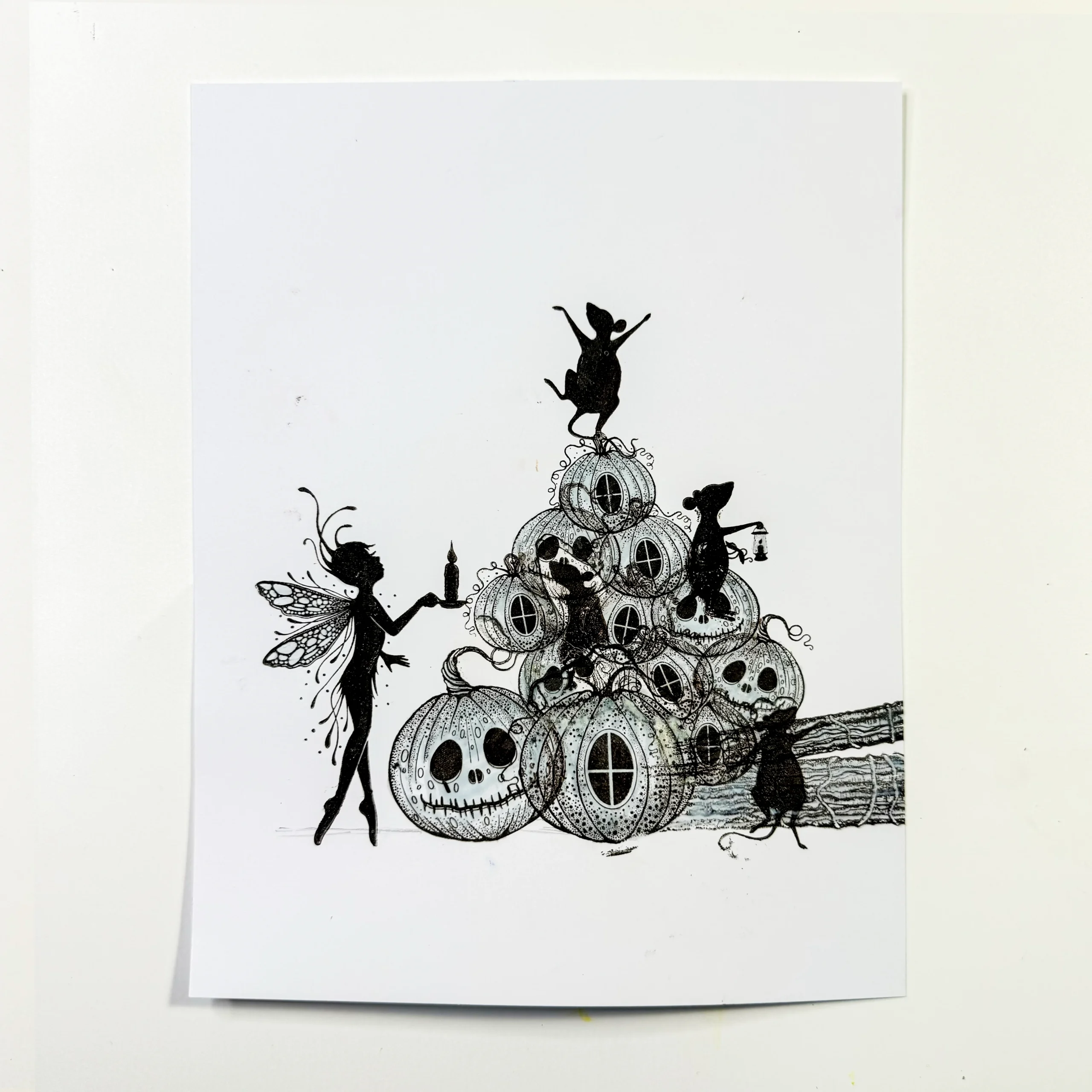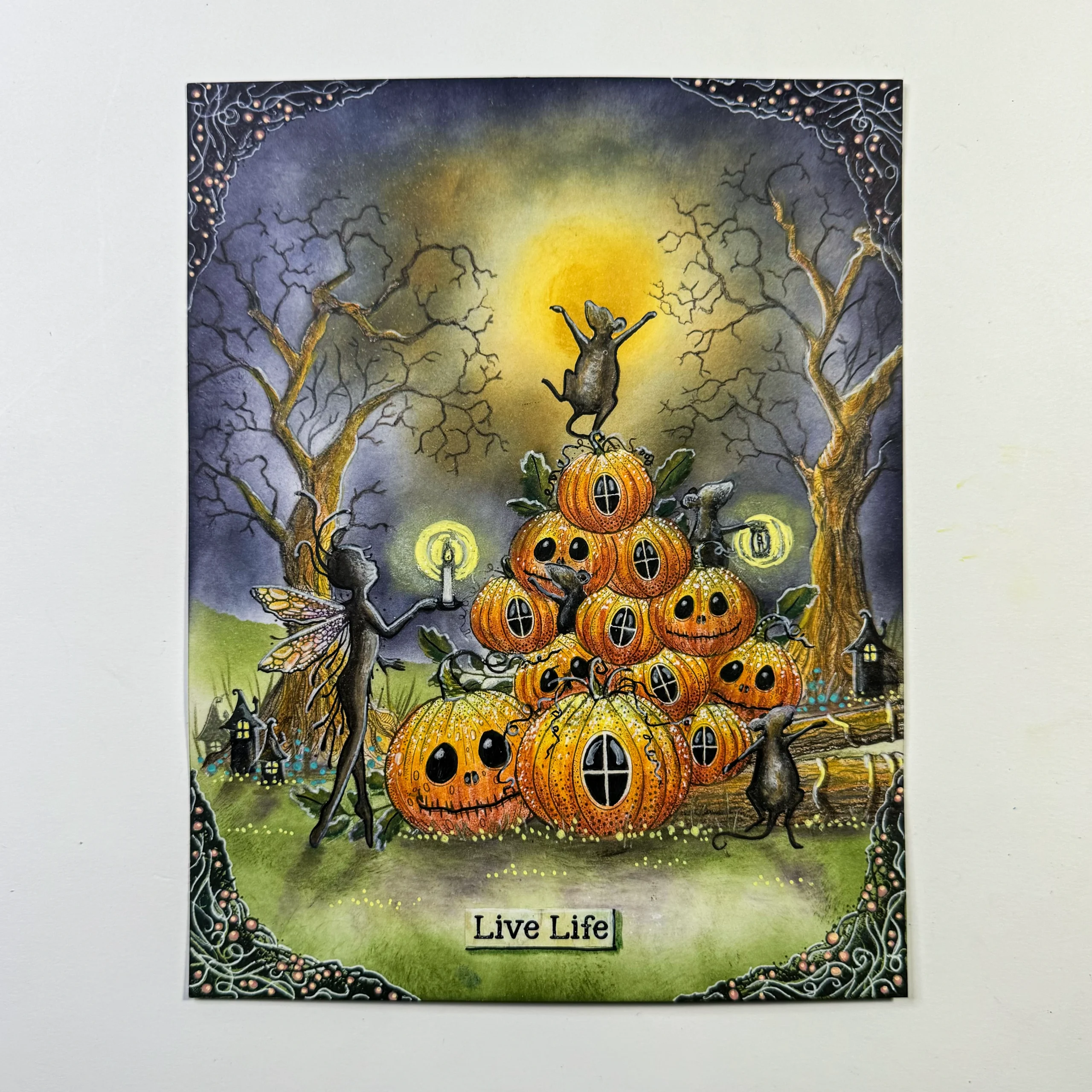 Time to colour everything. I use the lovely Mondeluz Watercolour pencils. The pumpkins I colour in yellow, light orange, orange and brown orange. The trees and logs in yellow, ochre, medium brown, dark brown and black. The leaves in green and yellow. The pumpkins eyes and windows I add some black Fineliner pencil. Colour the fairy and the mice in black, brown and ochre. For the highlights use a white Posca pen. Use the Yellow Pan pastel to ”light up” around the candle and lantern. Fill in the branches of the trees with dark brown watercolour pencil if necessary. I drew some extra branches in the middle of the trees as well.
