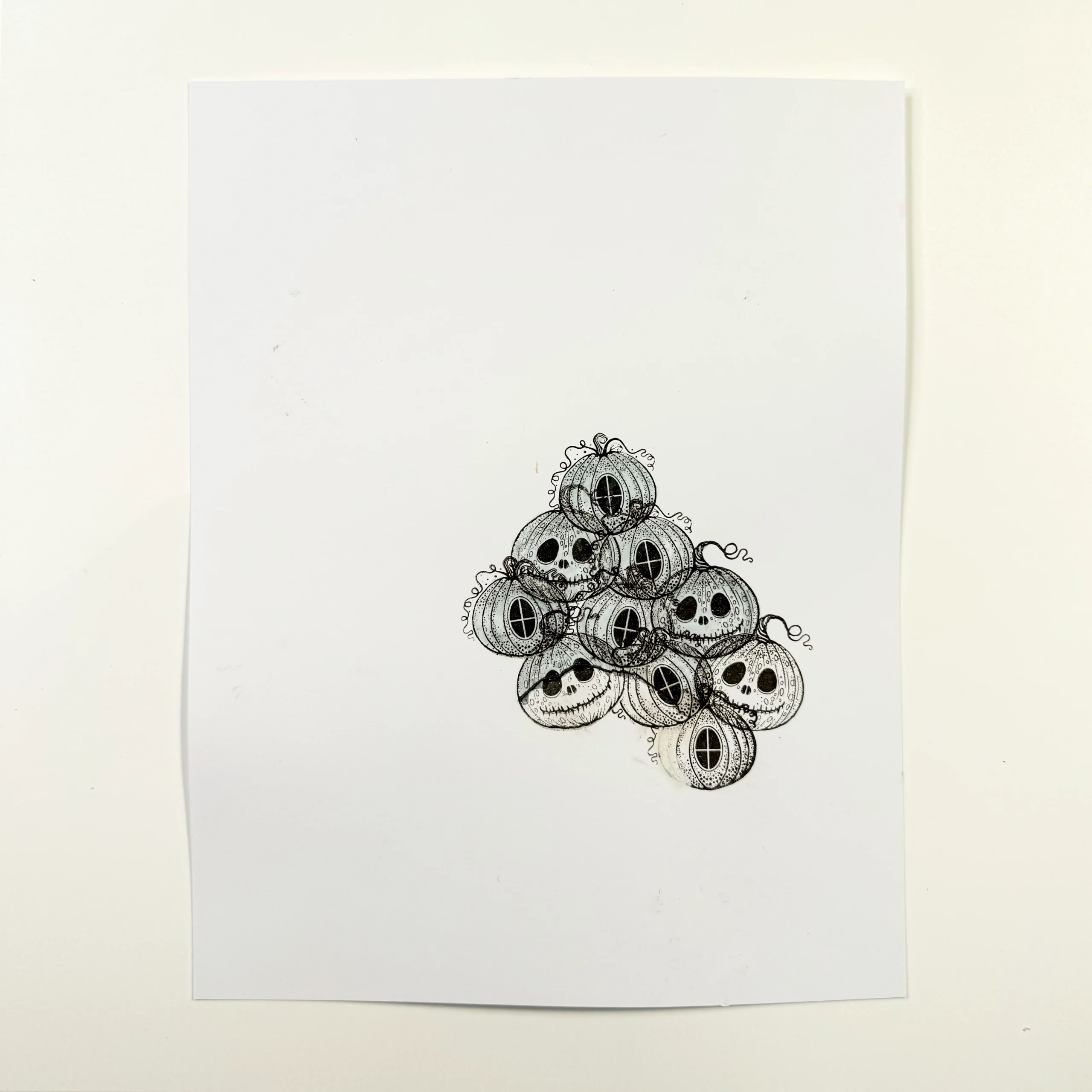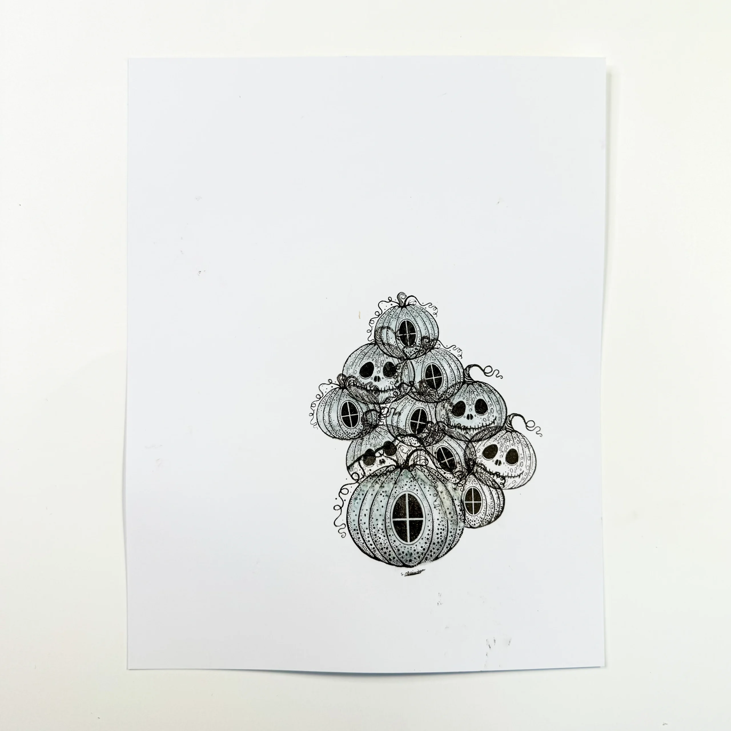 Stamp the pumpkins from top to bottom. First stamp a pumpkin and cover it with Masking Fluid. Continue stamping one pumpkin after another and use the Masking Fluid on each one. Don’t cover the bottom ones completely because we are going to stamp two large pumpkins that should be in front. Look at the picture for placement.