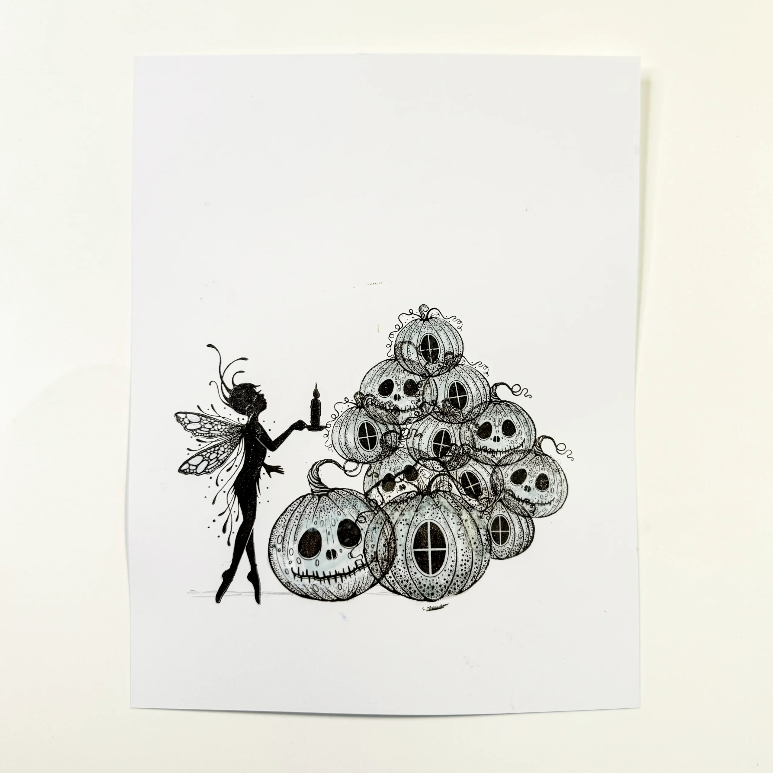 Last pumpkin to stamp, Playful Pumpkin Stamp LAV821. Also stamp the new fairy Briana LAV923 and cover both the pumpkin and the fairy with Masking Fluid.