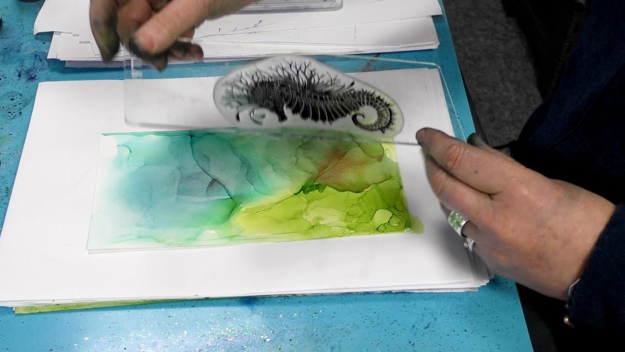 We end this week’s demonstrations with the third video in our aquatic trilogy. The lovely swirly under-the-sea background was created with blending solution and alcohol inks from our new own-branded “Pure” range, allied directly onto Yupo Card. This makes the perfect setting for our finely detailed Sebastian the Seahorse.