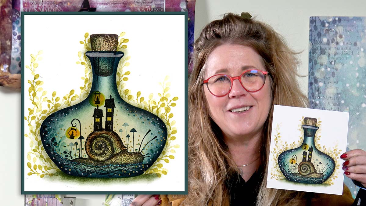 She demonstrates how to give the bottle a three-dimensional look by shading with various colours of Elements Inks, using differing sizes of stencil brush.