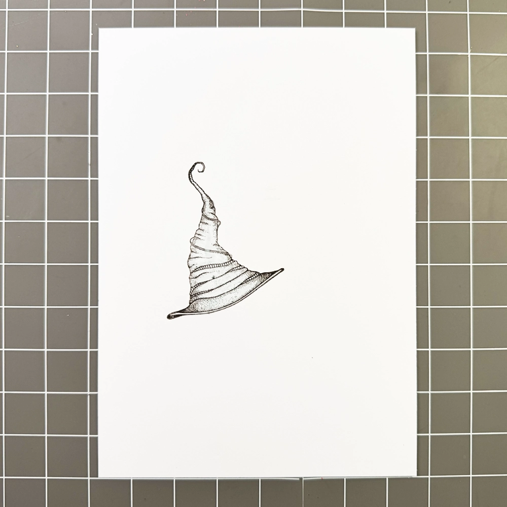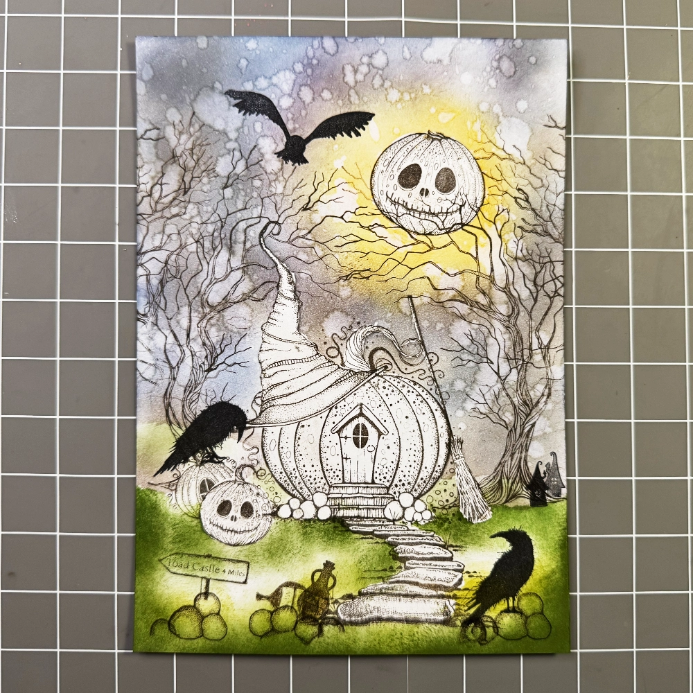 Start with an A5 white Multifarious card. Stamp the Witches Hat Stamp (LAV733) using Versafine Clair in Fallen Leaves. Using the acetate from Pumpkin Lodge (LAV818) and Fairy Path (LAV246), position them over your card to help measure and plan the placement of the hat. Once you’re happy with the layout, make sure the stamped image is completely dry, then cover the hat with Liquid Masking Fluid using a paintbrush to protect it for the next layers. Alternatively, you can use a masking sheet instead of masking fluid.