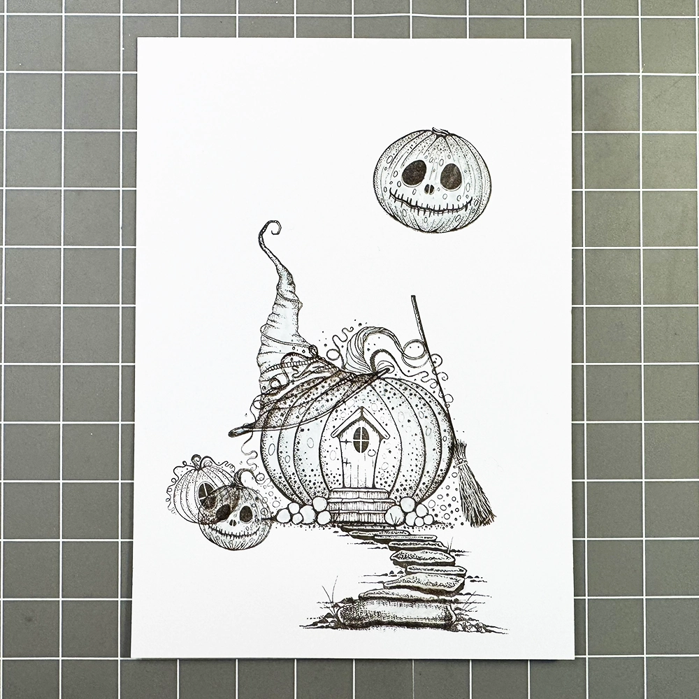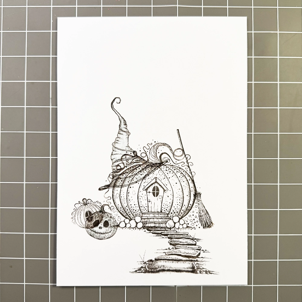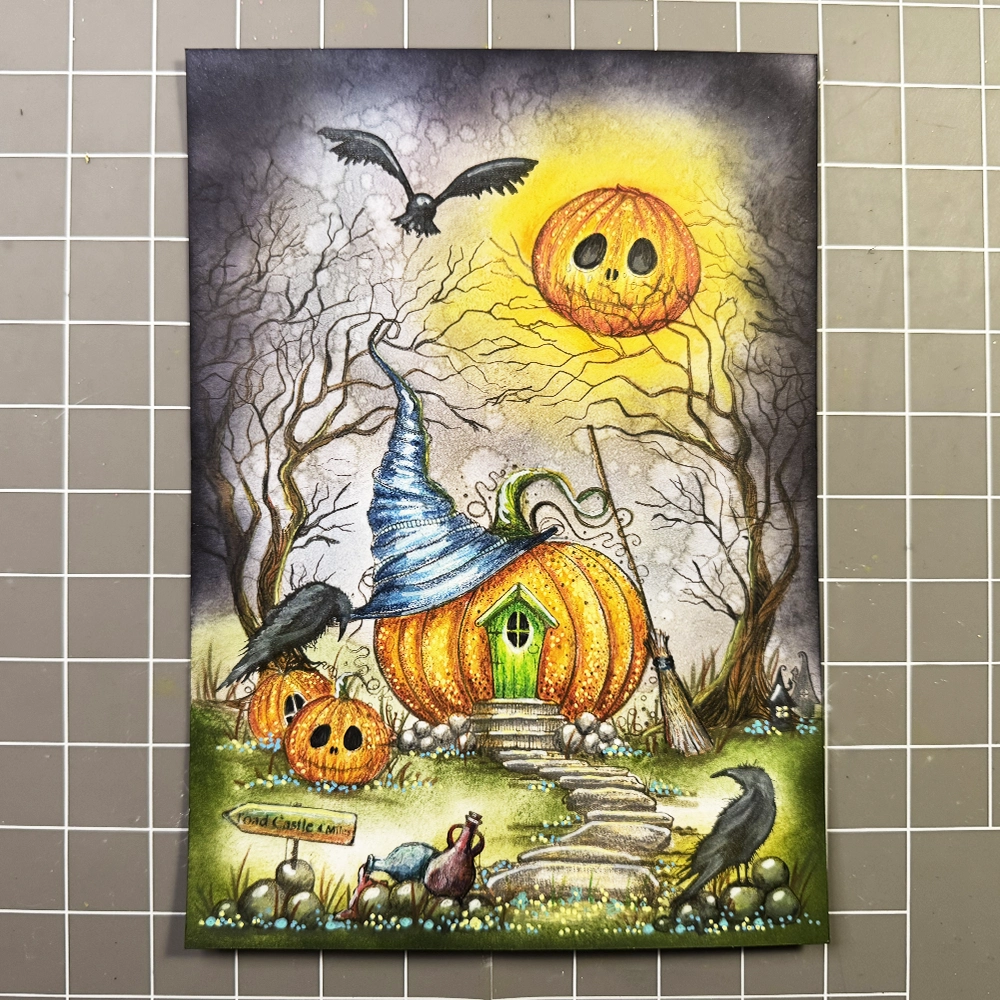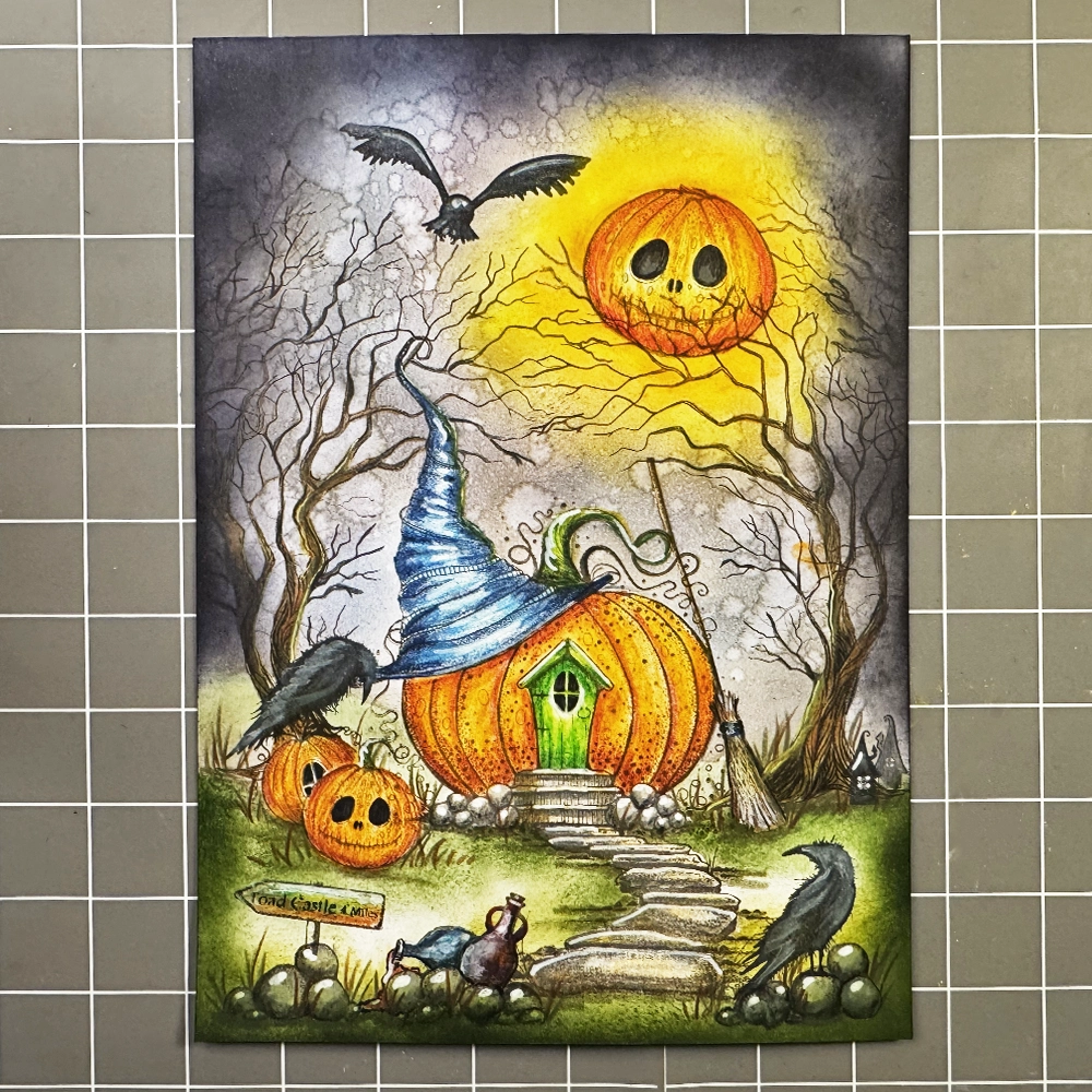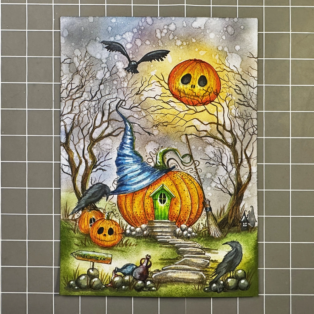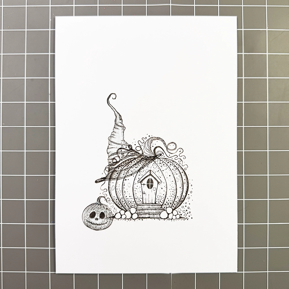 Now for the fun part… colouring! I have used the Mondeluz watercolour pencils in various shades of brown, orange, yellow, green, blue, and grey. I added grass details with a green watercolour pencil and highlights with a white Posca pen. To make the pumpkin’s eyes and the cottage window a true black, I used a black fineliner.
