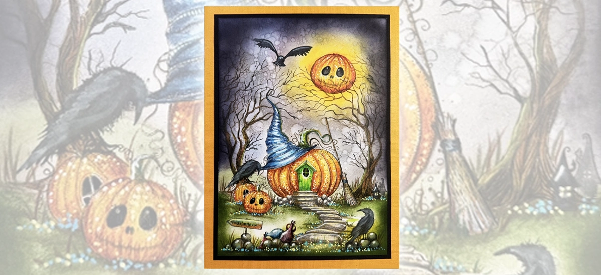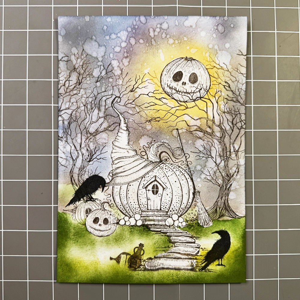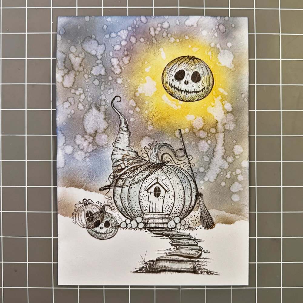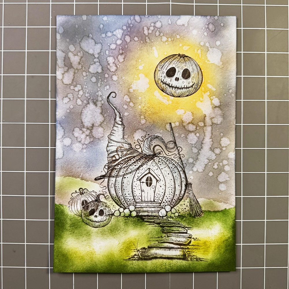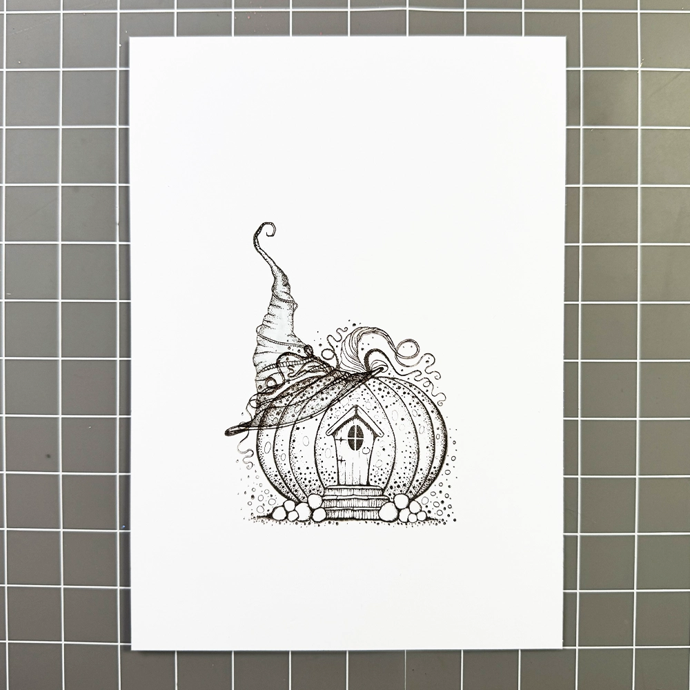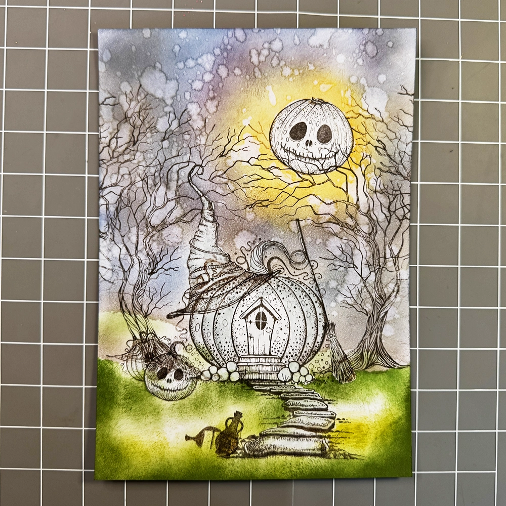 Now for the fun part… colouring! I have used the Mondeluz watercolour pencils in various shades of brown, orange, yellow, green, blue, and grey. I added grass details with a green watercolour pencil and highlights with a white Posca pen. To make the pumpkin’s eyes and the cottage window a true black, I used a black fineliner.
