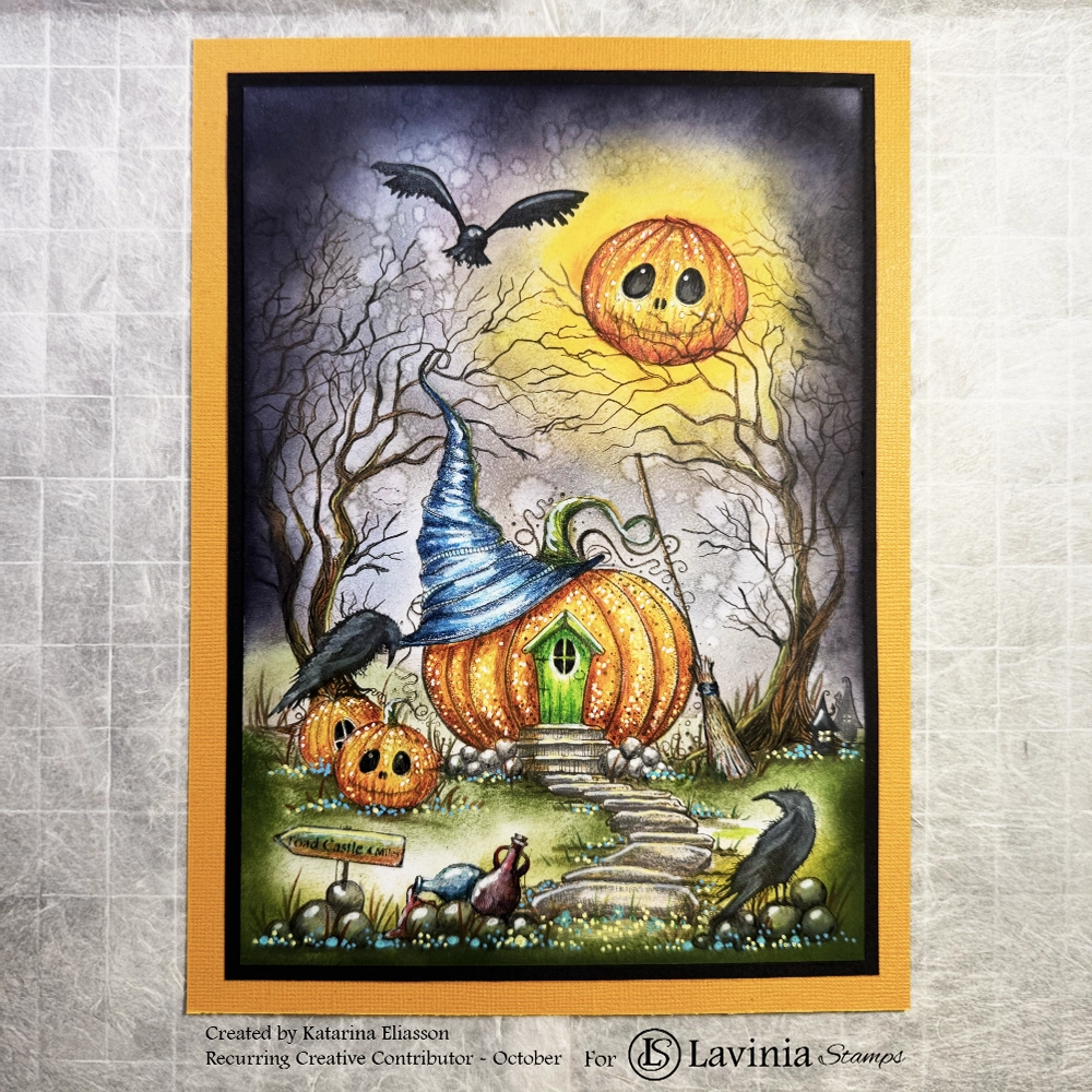 Gently remove all of the Liquid Masking Fluid. Then stamp two of the crows from the Crow Set (LAV540) in Versafine Clair in Nocturne; one on the pumpkin and one beside the Fairy Path.
